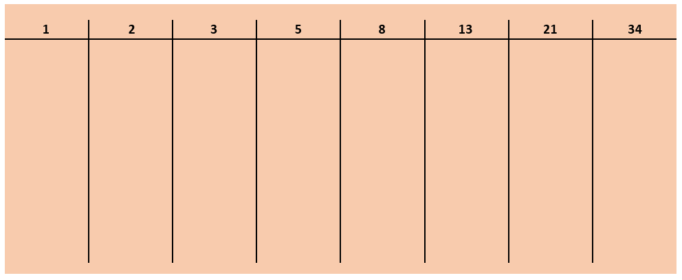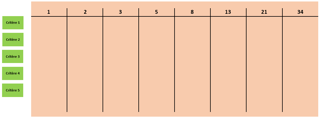Sur un grand brown paper, tracez 8 colonnes avec la suite de Fibonacci (1, 2, 3, 5, 8, 13, 21, 34…) en entête. Il s’agit des notes.