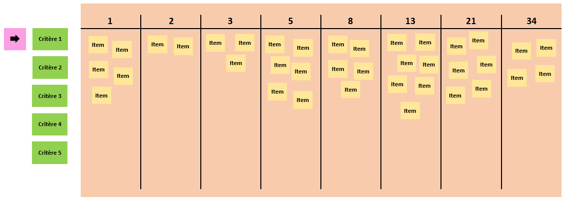 Descendre la flèche sur le critère de notation suivant, l’expliquer aux participants et leur redistribuer les post-it “éléments du backlog”. Ils devront à présent évaluer les éléments sur ce nouveau critère.