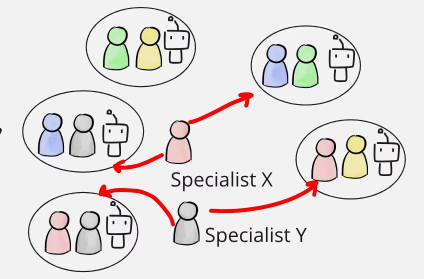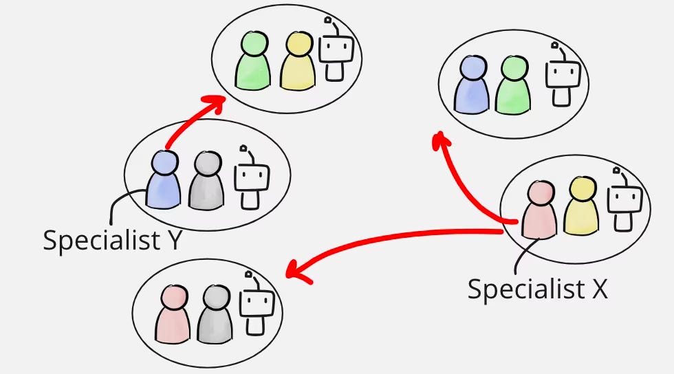 Une alternative est d’avoir des spécialistes itinérants qui n’appartiennent à aucune équipe spécifique, mais qui vont là où leur besoin est le plus grand. Pour être clair, les modèles d’IA devraient posséder la plupart des connaissances spécialisées nécessaires, mais le spécialiste humain est là en complément pour lorsque nous atteignons les limites de l’IA, ou avons besoin d’une paire supplémentaire d’yeux de spécialiste humain pour évaluer le résultat.