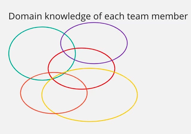 Lorsqu’on parle d’équipes et d’agilité, on imagine du travail effectué par de petites équipes auto-organisées et pluridisciplinaires. Pluridisciplinaire signifie que les membres de l’équipe possèdent différentes compétences qui se complètent. Le dessin ci-dessous utilise des cercles pour symboliser les connaissances et compétences qui se chevauchent de chaque membre de l’équipe.