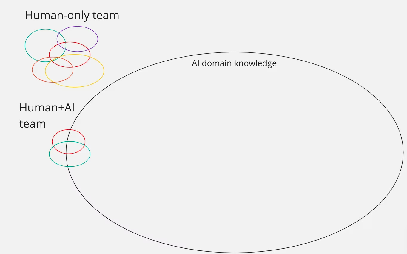 Mais avec l’IA générative, chaque personne a effectivement un collègue IA qui est incroyablement rapide et connaît tous les langages de programmation, tous les frameworks, tous les modèles, et possède bien plus de connaissances que n’importe quelle personne. En utilisant la même métaphore visuelle, ajouter un membre de l’équipe IA signifie ajouter un cercle de connaissances bien plus grand que n’importe lequel des cercles humains (bien qu’il y ait encore des connaissances humaines que le modèle d’IA n’a pas).