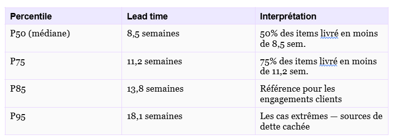 Étape 2 : Introduire les percentiles dans vos engagements. Remplacez « on livrera en moyenne en 10 semaines » par « on livre en moins de 13 semaines dans 85% des cas ». C’est plus honnête, plus utile pour les partenaires, et plus robuste quand vous êtes challengé.